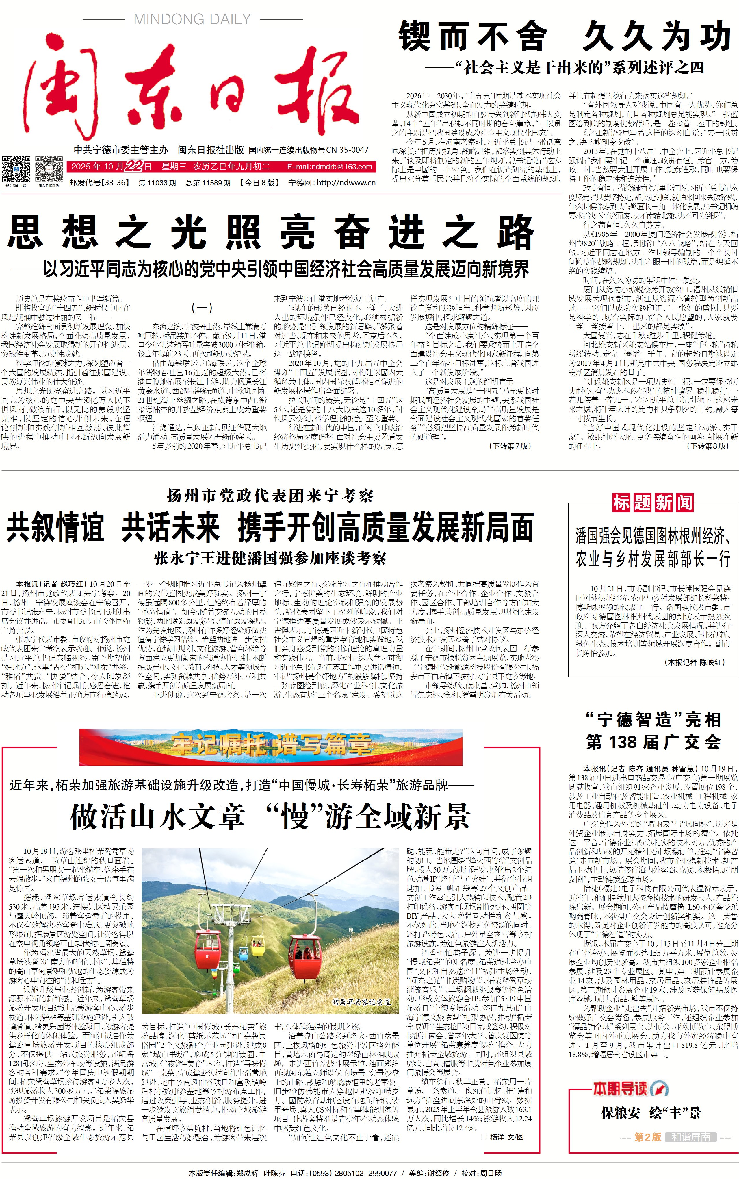 張永寧代表市委、市政府對揚州市黨政代表團來寧考察表示歡迎。他說,揚州是習近平總書記親臨視察、寄予期望的“好地方”,這里“古今”相照、“剛柔”并濟、“雅俗”共賞、“快慢”結合,令人印象深刻。近年來,揚州牢記囑托、感恩奮進,推動各項事業發展沿著正確方向行穩致遠,一步一個腳印把習近平總書記為揚州擘畫的宏偉藍圖變成美好現實。揚州—寧德雖遠隔800多公里,但始終有著深厚的“革命情誼”。如今,隨著交流互動的日益頻繁,兩地聯系愈發緊密、情誼愈發深厚。作為先發地區,揚州有許多好經驗好做法值得寧德學習借鑒。希望兩地進一步發揮優勢,在城市規劃、文化旅游、營商環境等方面建立更加緊密的溝通協作機制,不斷拓展產業、文化、教育、科技、人才等領域合作空間,實現資源共享、優勢互補、互利共贏,攜手開創高質量發展新局面。